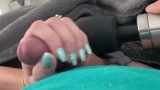 He can’t resist seeing my light blue fingernails against his cock. Cums on my hand