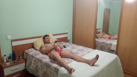 Tumbado solito en la cama disfrutando de una paja