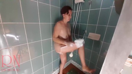 Nudist housekeeper Regina Noir washes in the shower with soap, naked maid shaves her pussy, brushes