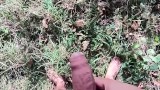 Naked hiking JO, cum and clean the pipe with warm pee