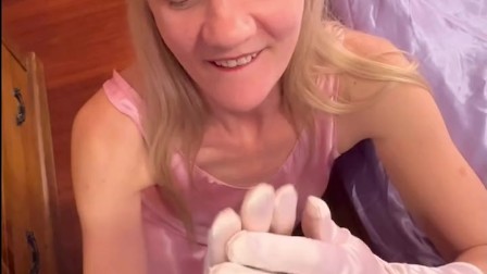 Cougar rubs cock with satin gloves after naughty photo shoot