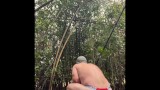 Stocky bear gets naked in the bamboo forest and plays with his ass and cock.