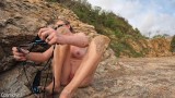 Busty girl masturbating, almost caught, embarrassed on beach
